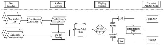This study pursues the development of a probabilistic model for detecting quality issues in advance for construction projects. For this reason, 2527 NCRs mostly causing reworks were collected from 59 diverse construction projects constructed by international construction companies. After that, these NCRs were analyzed based on the quality failure factors called “attributes” across the entire manuscript by using the Delphi technique. This means that each case was coded according to the involved factors. To move forward, the NCRs were preprocessed for machine learning, which necessitated one-hot encoding of the dataset. The result was a binary dataset. The technique used for machine learning was CBR, which relies heavily on the weights of the selected attributes, and the model was coded in a MATLAB environment. To assign proper weights to these attributes, two techniques were used, namely AHP and GA. Using two separate methods for weight assignment also helped compare the automated systems and expert opinion in CBR applications used in construction quality problems. As the main mechanism behind the CBR model is retrieving the most similar case to a given situation, the model was set to retrieve ten similar cases, which were used to calculate cost impact probability. Finally, the results were compared to the actual data to assess the accuracy of the CBR model (Figure 1).