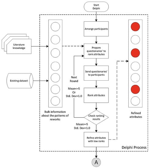 The attributes belonging to the first category were directly eliminated in the first round. However, the attributes falling into the second group, which needs another iteration, were sent back to the respondents. These attributes are marked with an asterisk (*). For example, the ‘Damaging material during transportation/loading’ attribute had a high standard deviation, thus making a second-round necessary. Finally, the third category was accepted without any change. It should be noted that design-related causes were not accepted as rework cases did not include the design phase. Therefore, there is only one item in the ‘Design’ category in the final attribute list (Table 4). Furthermore, panelists, specifically Panelists 1 and 9, commented on the given questionnaire. According to their suggestions, “Inadequate training”, “Inadequate staff”, and “Insufficient/improper workmanship” were similar terms and should be merged into one attribute. Their comment was accepted, and the three attributes were represented by a new attribute, called ‘Inadequate staff and insufficient/improper workmanship’. On the other hand, panelists recommended that ‘Problem with warehouse (Labeling, etc.)’ and ‘Problems with documentation’ should be combined; however, this comment was rejected since the latter constitutes more than the former. At the end of the process, a final list emerged consisting of the 25 diverse attributes categorized into five different groups (Table 4). It should be emphasized here that the primary purpose of this process was not only to extract the final attribute list but also to assign a weight to each attribute observed in quality failures. This enabled the generation of a binary form (1 or 0) for each case, indicating whether or not a related sub-attribute exists in an NCR. The final list of attributes can be seen in Table 4. The overall process of the Delphi technique is given in Figure 2.
