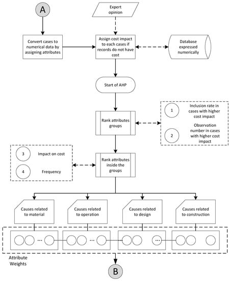 Figure 3 shows the overall AHP process that was applied to this study. Rework cases were binary coded, i.e., the attribute was assigned a one (1) if it was observed in the non-conformance case and a zero (0) if this was not the situation. The weighted sum (fwi) of all attributes was calculated by aggregating the observation frequency of each item (fij) for the cost impact (ci). The weighted summations were normalized (fwi-norm) in each group and multiplied with the frequency (fi) to calculate the comparison criteria (cci) before AHP. Table 7 shows the process information of this study (the design attribute was not included since it had only one attribute).