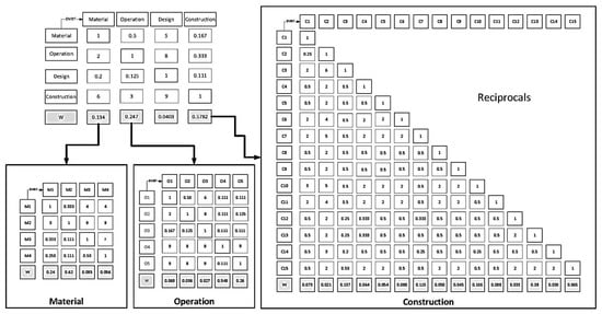 AHP is commonly used as a decision-making tool [,]. Through pairwise comparison, the method ranks various alternatives. Although these alternatives can be sorted manually, such a method would lead to a bias in selection, affecting the overall decision. Inconsistency in the expert opinion is overcome by AHP [] with the help of inherent indices such as the consistency index (CI) and the random consistency index (CR). According to the definition of Saaty [], AHP steps are as follows: