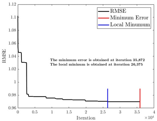 Here, yi′ is the actual cost impact and y′ is the prediction. The 35,872nd iteration gave the minimum error, and the local minimum was 26,375th (see Figure 5). Table 9 provides the resultant weights.