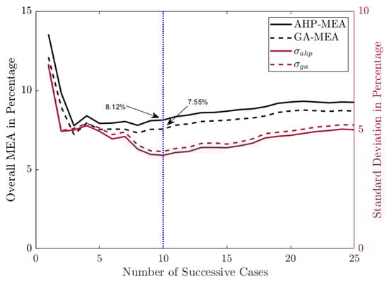 As a comparison between expert opinion and computerized algorithms to CBR models, the study showed that the GA algorithm outperformed AHP in terms of MAE. While the minimum MAE of GA was 7.20%, that of AHP was 7.76% when three successive cases were used. Furthermore, it was found that for the standard deviation to be the minimum, the number of successful cases should be set to 10. The results are provided in Table 10 and Figure 7. Here, emphasis was given to lowering the uncertainty. Therefore, ten successive cases were used in the model.