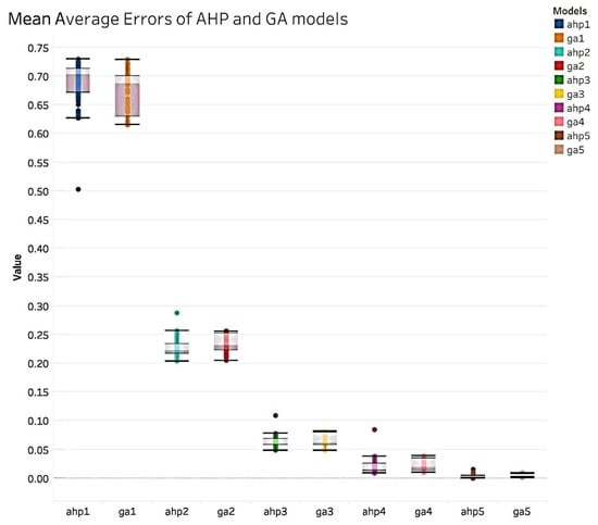 As shown in Table 10, although the average MAEs of the five cost impacts in the model using attribute weights obtained via GA were lower than those obtained via AHP, the standard deviations of the cost impacts in the AHP model were lower than with GA. Furthermore, while the overall MAE and standard deviation with AHP were 8.12% and 3.93%, respectively, they were 7.55% and 4.09% with GA. It was evident that the two techniques did not differ significantly (Figure 8).
