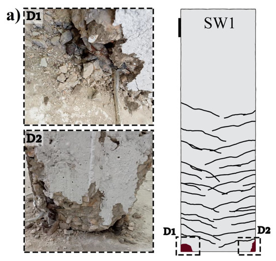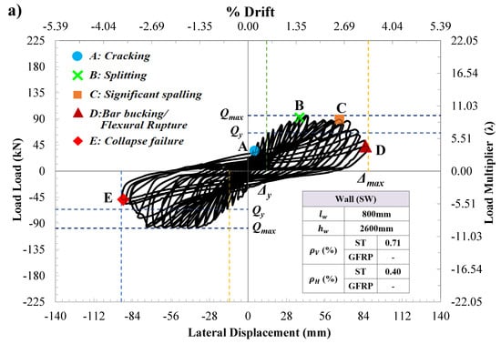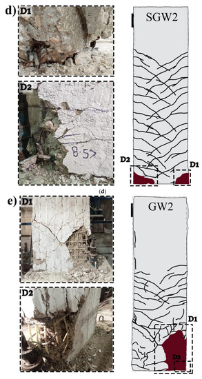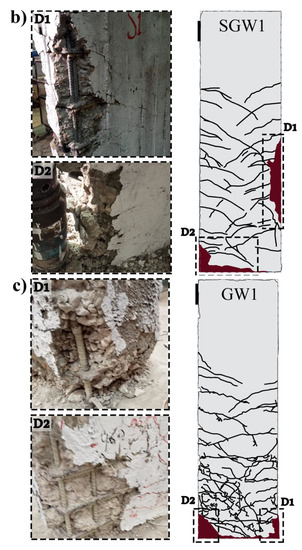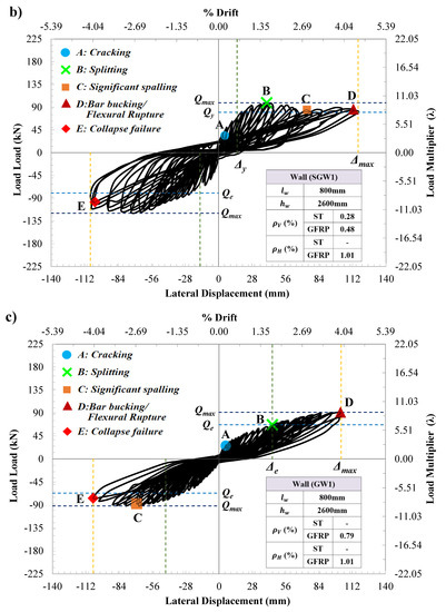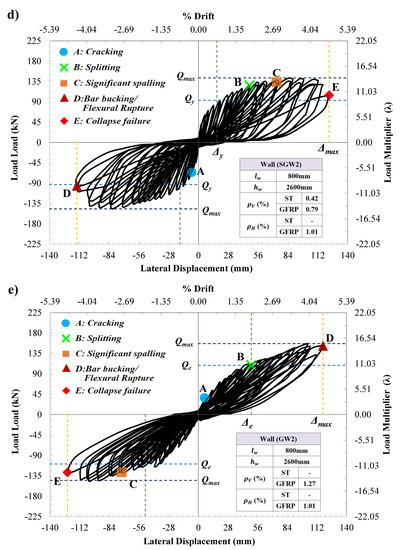 In general, the behavior of all tested walls was dominated by a flexural response, as a typical number of horizontal cracks were formed up to a height of approximately and was accompanied by diagonal shear flexural cracking of the web without any premature shear or anchorage failure. The failure mode for all walls was characterized by horizontal cracking and concrete spalling, with flexural cracking then formed at the base cross-section due to the developing bending moment. As drift increased, spalling of the concrete cover became more significant on the compressed side of the wall, followed by buckling/rupture of the outermost vertical reinforcements bars and crushing of the concrete at the toes, as shown in Figure 7. The sliding shear failure mechanism was only observed in walls GW2 and GW3, where sliding shear deformations are developed after maximum strength due to the web’s diagonal cracking, as shown in Figure 7e,f.