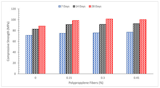 The compressive capacity of the concrete is only marginally impacted by the addition of polypropylene fiber. Concrete’s compressive strength was marginally reduced as fiber concentration increased. In concrete, fiber insertion increases the interfacial transition zone (ITZ), which may have an impact on compressive strength. With the inclusion of 0.3 percent of fibers, a maximum 10 percent drop in compressive capacity (in comparison to the control concrete) was noted [76]. In a study, compressive strength decreased when polypropylene fiber amounts greater than 0.2 percent were added to the binary mixture of steel (0.8 percent fixed) and polypropylene fiber (0–0.4 percent) [77]. However, the inclusion of polypropylene fibers raised the compressive capacity of concrete by up to 0.2 percent. Steel fibers may have an impact on the rise in compressive capacity (up to 0.2 percent polypropylene fiber with 0.8 percent steel fiber).