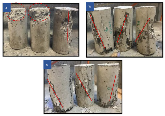 Under compression, many fiber-reinforced concrete failure mechanisms were seen. The tested cylinders’ mechanisms of failure, both with and without fibers, are shown in Figure 5. The control samples with 0 kg/m3 exhibit localized crushing at the top/bottom ends of the cylinders and splitting fractures along the height (Figure 5a). Plain concrete has been observed to be susceptible to this form of failure, which is typically brought on by the concrete’s friction angle and the abrasion of the sample surface against the loaded steel plate (for the samples that failed at the end portion). Shear failure became the predominant form of failure as a result of the addition of macro poly fibers to the concrete (Figure 5b,c). This form of failure is listed as a potential failure mechanism for plain concrete, and it is often brought on by friction between the surface of the concrete and the loaded steel plate (in the case of the vertically split sample) (for the samples that failed at the end portion). Shear failure was a significantly different form of failure due to the addition of macro poly fibers to the concrete (Figure 5b,c).