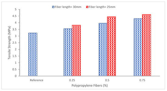 Polypropylene fibers increased the tensile strength of concrete, as seen in Figure 6 and Table 4. It is clear that, similar to compressive strength, concrete’s tensile strength increased to some amount with the addition of polypropylene fibers. The tensile qualities of concrete are shown to benefit from the addition of polypropylene fibers to a concrete mixture. In the concrete matrix, the fibers serve as crack deterrents. With fiber addition up to roughly 0.25 percent over the control (0 percent fiber) concrete’s tensile strength, concrete’s tensile splitting strength was found to be higher than the control concrete [76].