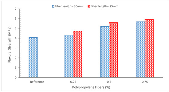 By preventing fractures from developing, fibers increase flexural capacity. Due to the interfacial between the fibers and the concrete components, the load is directly transmitted to the fibers. By enabling the crack to spread over them and transfer the weight, fibers stop fractures from breaking. The structure has greater flexural strength since the fibers and concrete matrix can sustain the force as a whole [49]. Short fibers added to cement concrete somewhat decreased its flexural strength. Longer fibers have a bigger bonding surface with the matrix, which results in a higher pull-out load and more effective fracture bridging [89].