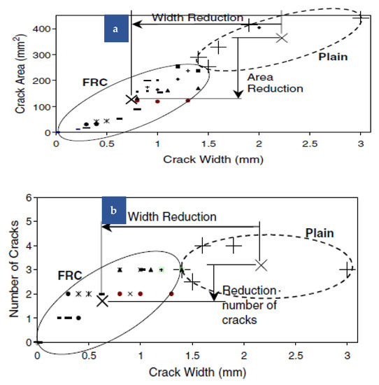 Figure 11 shows how fiber reinforcing affects the crack pattern. The greatest fracture widths seen in these tests are shown against the crack areas indicated in the numerous individual tests in Figure 11a. The number of cracks found in each test is displayed against the largest fracture width in Figure 11b. Both Figure 11a,b show the centroids of the families of data points for plain overlays and fiber-reinforced overlays. Observe how the reductions in fracture area, maximum crack width, and number demonstrate the effect of fiber reinforcing. According to one study, when the volume percent of the fiber in the concrete mixture increases, fracture breadth reduces, perhaps due to a stronger “fiber bridge effect” in the concrete matrix [65].