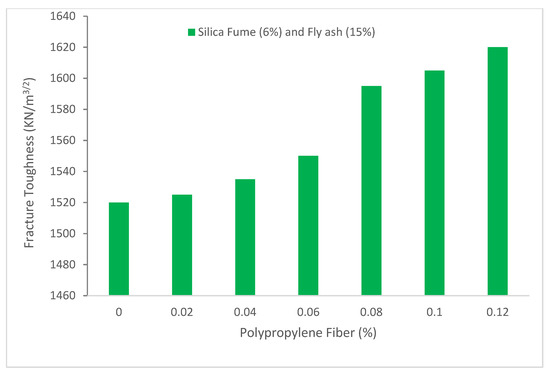 Figure 12 shows the differences in fracture toughness of polypropylene fiber-reinforced concrete as a function of fiber volume fraction for a three-point bending beam specimen after 28 days of curing, with a fly ash content of 15% and a silica fume concentration of 6%. In general, the use of polypropylene fiber can make fly ash and silica fume-containing concrete more resilient. The improvement in toughness for the concrete with 0.12% fiber was 6.4 percent, as compared to the concrete without polypropylene fiber. Toughness progressively increases with an increase in fiber volume fraction. However, the fiber volume fraction does not exceed 0.12% due to a lack of flowability, which adversely affects the strength of concrete. Furthermore, when the fiber volume fraction is less than 0.06 percent, the influence of polypropylene fiber on toughness is less noticeable [91]. The increased energy required to propagate the crack along the zigzag crack route was thought to be the cause of the increase in the load needed for full fracture.