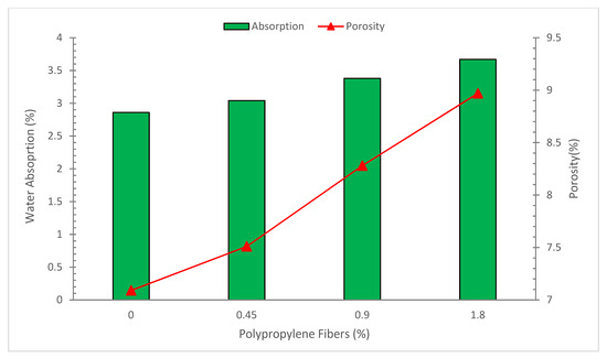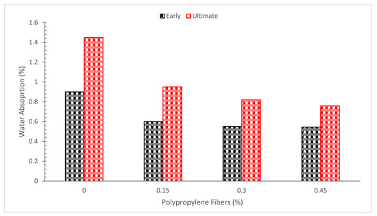 The capacity of concrete to withstand the entry of harmful ions is another important component that influences concrete durability. Concrete’s absorption properties serve as an indirect indicator of its porosity while also providing important details regarding the amount of permeable pores within the concrete and the connection between those pores. Figure 13 shows how various fiber-reinforced concretes used in this investigation absorbed water.