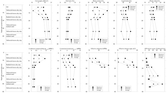 The soil properties along the depth were characterized with a series of laboratory tests and in situ tests. The top layer was formed by fill with a thickness of 0.3–9.7 m. Under this, there was soft silty clay with high compressibility and a thickness of 1.20–7.60 m. The third layer was also soft silty clay with a thickness of 2.3–7.2 m. It was in a medium-to-high compressible state. Beneath this layer, there was a 3–5.1 m thick reddish-brown silty clay, with medium plasticity and compressibility. The fifth layer was a 0.7–4.4 m thick yellowish-brown silty clay, with medium plasticity and compressibility. The typical soil profiles and material properties are shown in Figure 1. The effective cohesion, c′, and friction angle, ϕ′, were obtained using a direct shear test. The coefficient of compressibility, , and constrained modulus, , were defined using oedometer tests. As indicated in Figure 1, based on the SPT blown counts, the 2nd and the 3rd layers could be classified as soft clays. Layer 4 was firm clay, and layer 5 was stiff-to-very-stiff clay.