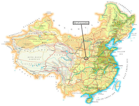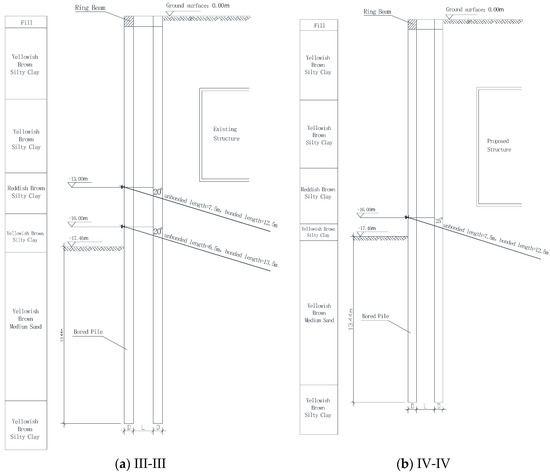 The site of the excavation was located in Xi’an, China (Figure 2). As shown in Figure 3, the pit size in the plan of the excavation was about 15,000 m2. The retaining structure was made of cast-in-place bored piles, which were footed in sand and constructed before excavation. Sections of the retaining walls are shown in Figure 4 and Figure 5. On the north and east sides, the diameter and embedment length of the concrete piles were 800 mm and 10.6 m, respectively. The piles were spaced 1.5 m apart from center to center with ring beams at the top, which had a cross section of 1000 × 800 mm2. As shown in Figure 4, for each pile, totally, there were four prestressing tendons with a typical vertical spacing of 3.5 m (I-I in Figure 4). On the west side, as the excavation was close to an existing metro station, installation of anchors in certain area was not allowed. Therefore, the number of anchors was reduced to one or two per concrete pile along the depth of the excavation. In order to keep the displacement comparable to that of the north and east sides and meet the major deflection and settlement limits at the top of the retaining wall of 30 mm and 20 mm, respectively, as required by Chinese code [20], double-row bored piles were adopted on the west side of the excavation (II-II in Figure 4; III-III and IV-IV in Figure 5). The diameter of these piles was 700 mm/800 mm, and they were spaced 2.0 m/2.5 m apart from center to center between two rows, where the cross section of both ring beams and cap beams was 800 × 900 mm2. The south side of the excavation was another excavation pit with similar depth and retaining system, and no retaining walls were built in the middle of the two combined pits.