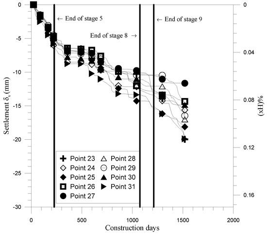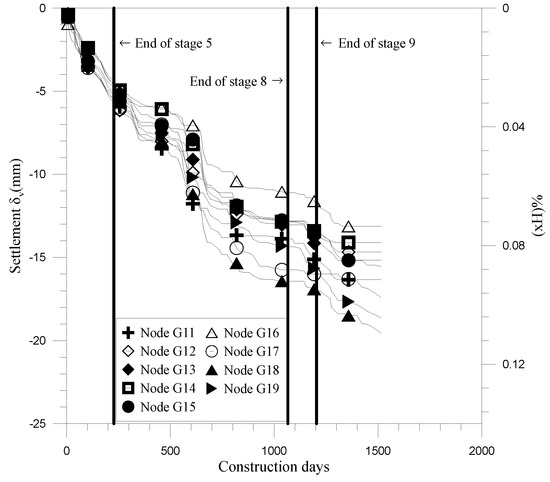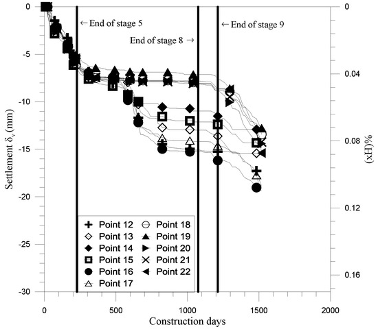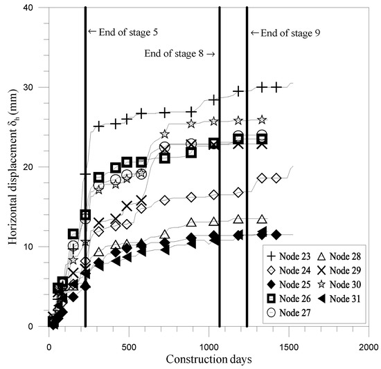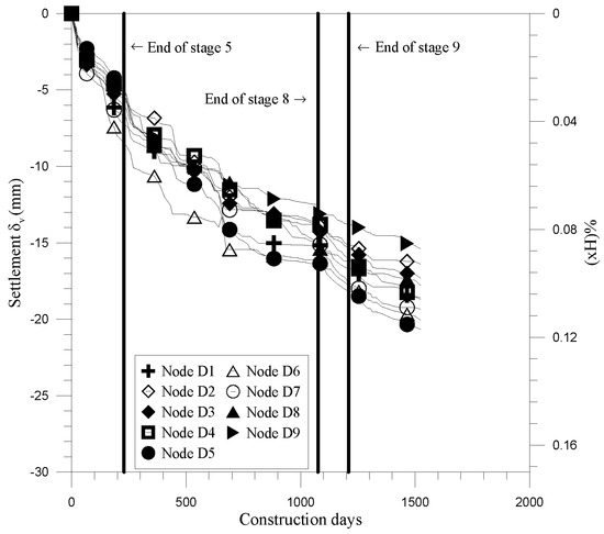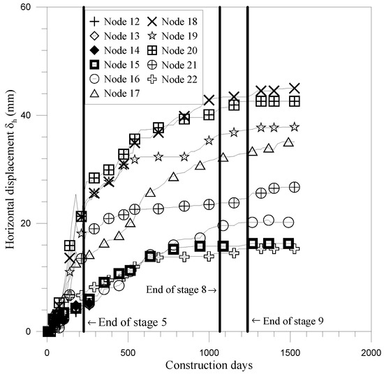Figure 7, Figure 8 and Figure 9 show that when the excavation reached the final depth, the immediate vertical settlement of the retaining wall recorded at the ring beam was around 6–8 mm. After that, settlement continuously increased at a slower rate. As depicted in Figure 8, there was an obvious platform of the settlement values after the excavation was finished (end of stage 5). The reason might have been that the access ramp in this area helped to restrain the settlement of the retaining wall, but the total settlement was not affected by the ramp after it was removed (see Figure 7 and Figure 8). It is indicated in Table 2 that when the excavation reached the final depth, the averaged settlement values were about 6.6 mm, 5.9 mm and 5.2 mm, and additional settlement values of 9.2 mm, 7.6 mm and 9.1 mm were achieved post-excavation, respectively.
