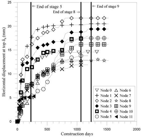 It is widely reported that the maximum deflection of a retaining system generally occurs close to or around the bottom of the excavation [2,3,5,7]. Since the lateral deflection of the retaining wall along the depth of the excavation was not monitored, whether the maximum deflection of the wall occurred at the top of the retaining wall remains unknown in this study. Meanwhile, the deflection in the middle (nodes 5 and 6) was not greater than that on the edge (nodes 0, 1, 10 and 11) on the north side; therefore, the edge effect (where the lateral deflection of the retaining wall in the corner is normally smaller than at other locations) as reported by Tan and Wei [7], was not observed in this research study.