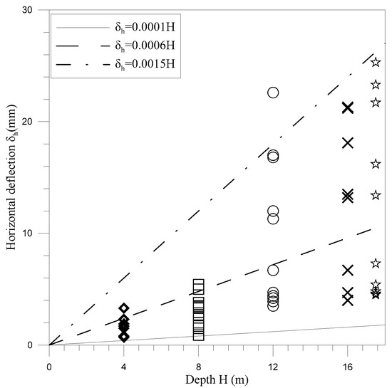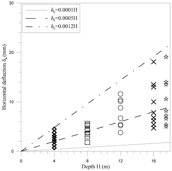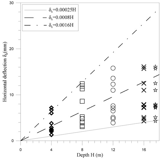 3.7. Relationship between Horizontal Deflection and Excavation Depth of Retaining Wall