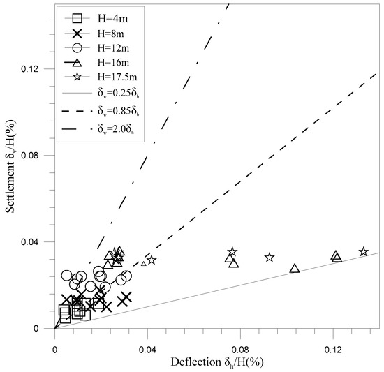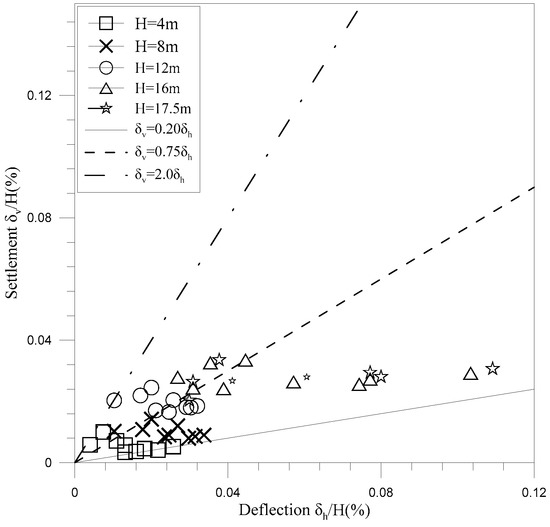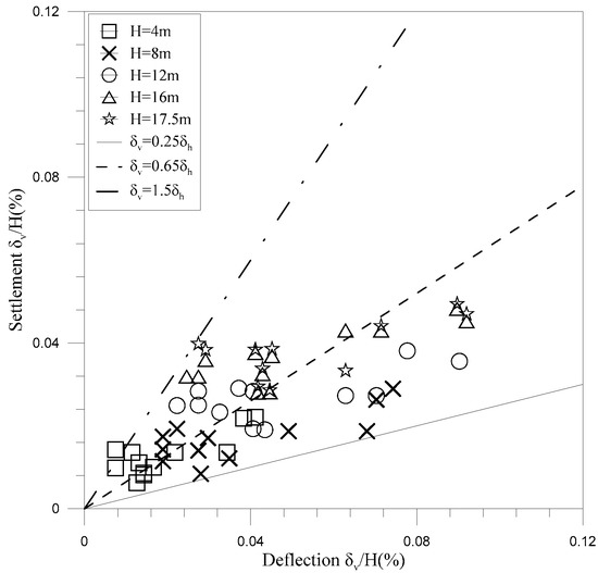 Since the horizontal movement of the retaining wall along the depth was not monitored in this study, the ratio of settlement to the maximum horizontal deflection is not available in this study. Figure 20, Figure 21 and Figure 22 show that the minimum and maximum settlement-to-deflection ratios recorded at the top of the retaining wall were about 0.2 and 2.0, respectively. As far as the authors are aware, there is no relationship between the settlement and deflection at the top of the retaining wall available in the open literature; therefore, a direct comparison to other cases is not possible. For reference, for other deep excavations in soft soil, Xiao et al. [27] found that the ratio of the maximum ground surface settlement to the maximum movement of the retaining wall was in the range of 0.05–0.7 based on 92 cases, and Wang et al. [3] reported the range of 0.4–2.0 based on 300 cases in Shanghai, while Moormann [2] reported 0.5–2.0. However, Ou et al. [12] observed that the relationship was in the range of 0.56–0.78 for deep excavations.