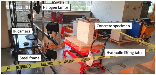 Four halogen lamps, each with 400 watts of power (supplying 1600 watts in total), were used as a thermal excitation source. The halogen lamps were mounted on a modular steel frame. They were located at a distance of ~1.17 m away from the tested concrete specimen and were tilted at a slight angle, to obtain reasonably uniform heat distribution on the surface (Figure 5). A hydraulic lifting table was used to support the concrete slab in the required position and allow its safe handling. Due to the low thermal diffusivity of concrete, compared to other materials [] and, consequently, the slow rate of heat flow through its cross-section, the specimen was heated for 2 h. At the end of the heating stage, the halogen lamps were turned off and the concrete slab was allowed to gradually cool down at room temperature for 1 h. Figure 6 displays the complete view of the experimental setup that was employed in this study.