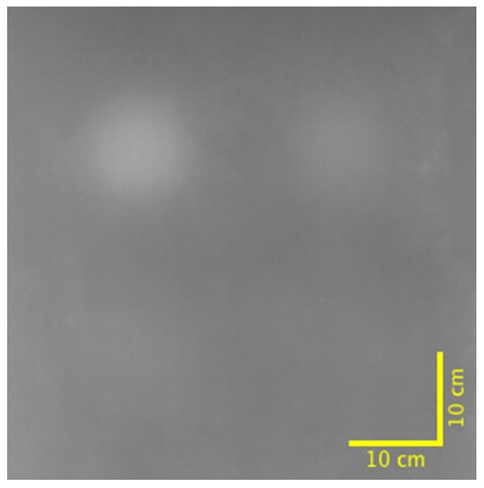 During the laboratory test, we used the built-in IR Flash© software (version 2) to handle and control all the basic operations of the IR camera. During the acquisition process, the temperature span of the camera was adjusted and maintained at a constant level (19–32 °C). The data acquisition for the sequence of IR thermal images was carried out using the system’s software. The acquired thermal images were displayed in a grayscale palette comprising 256 levels. The spatial resolution of the acquired images was 6.5 pixels per cm. As an illustration, Figure 7 shows the metric for a true scale of a 10-centimeter length (i.e., 65 pixels in each direction), over a snapshot of the block specimen.