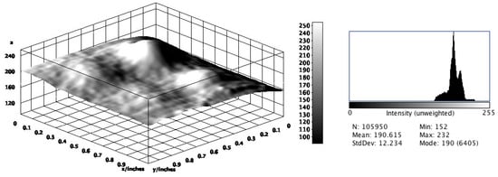 The region of interest (ROI) of the concrete specimen was manually masked and extracted using the ImageJ software (version 1.53r) []. Thereafter, the segmented ROIs, each of 325 326 pixels, were saved as an 8-bit TIF format, and the temperature values for all pixels (matrix of temperatures) were extracted and exported in a CSV format. An example of a grayscale thermal image, along with its histogram, is shown in Figure 8. These data were imported and processed using an internally developed MATLAB© code (version R2022a). The data were quantitatively analyzed using two methods: (a) a thermal contrast analysis of surface temperature measurements; (b) a wavelet-based analysis of the indexed (grayscale) images. These processing techniques are described in detail in the next sections.