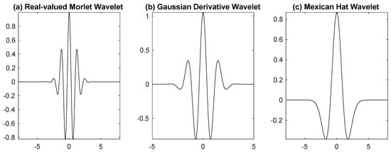 Graphs of the most common wavelets used for continuous analysis: (a) Morlet, (b) a Gaussian derivative, and (c) a Mexican hat.