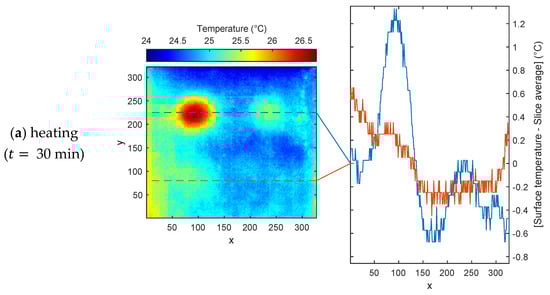 Figure 12 shows selected IR thermal images, along with their temperature profiles, for varying exposure times of the heating phase. For each thermal image, the two thermal profiles were calculated according to the difference between the surface temperature values and the average of the surface temperatures along the dashed lines (i.e., slices). Defects closest to the concrete surface, D2–D4, registered higher temperatures than the surrounding sound areas after about 30 min of heat exposure. Apparently, defects at depths of 2 and 3 cm have larger contrast and better-defined geometry than the defect at a depth of 4 cm. Even though the location of defect D5 was posing as a possible defect after a longer heating time (>60 min), it was hard to detect its size and shape. This factor is reflected in the shape of its temperature difference profile, which had a more flattened curve compared to the clear peaks seen with other defects. The air voids (embedded Styrofoam targets) act as insulators, due to their low thermal conductivity, reducing the heat transfer from the concrete to the voids and elevating the temperature in the areas above them. This results in a faster increase in the surface temperature of defective areas than in intact areas. Deeper voids tend to take a longer time to visualize, due to the lower amount of radiation that reaches them [].