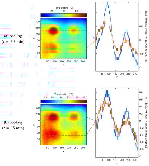Selected thermal images at the end of (a) 7.5 min of cooling and (b) 15 min of cooling, in which the blue and red dashed lines correspond to temperature profiles over the sound and defective areas.