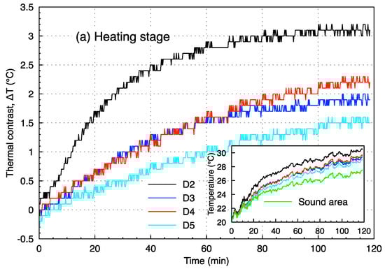 As can be seen, by comparing Figure 14a with Figure 14b, the of the deeper defects D4 and D5 had the lowest rate of temperature loss during passive cooling, compared to D2 and D3. This observation enables us to state that while defect D4 was cooling down, its recorded temperature maintained a higher level than defect D3; this can exclude the aforementioned assumption of poorly compacted concrete in that area. Hence, this means that the cooling phase can be more effective in differentiating the deeper voids from the shallower ones. That having been said, a note of caution is due at this point, since the thermal contrast analysis of raw data is not only limited and cannot be easily automated but also requires a long time period to interpret the results with a high level of certainty.