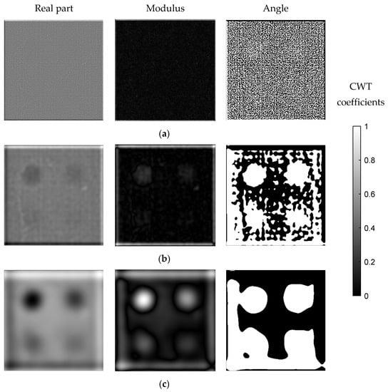 In our process, the raw grayscale images were post-processed one at a time. The image processing, using the Mexican hat wavelet function, was performed using MATLAB©, with the aid of the Wavelet Toolbox™ (version 6.1) []. Typically, the performance of the wavelet algorithm (and the computational complexity of data processing) increases with an increase in the scale factors to a certain limit []. It is noteworthy that adjusting the scale parameter will adjust both the spread spectrum and the bandwidth of the wavelet []. For visualization and analysis purposes, the scale vector and the angle were intuitively judged and were manually set to {1, 5, 10, 15, 20} and 0 rad, respectively. After applying the wavelet transformation on a number of selected thermal images, the CWT coefficients are decomposed into four different components, namely, the real part, the imaginary part, the modulus, and the angle.