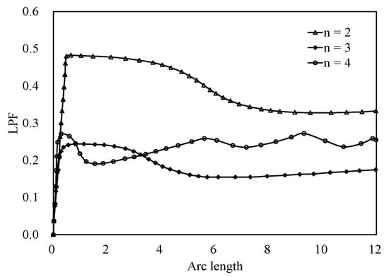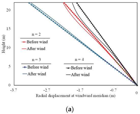 - When the wind attack angle is the case of , which means that the windward meridian is arranged to go through the starting point () of the harmonic settlement, the wind load capacities () with HSIIs decrease to 73.4% (wave number ), 37.5% (wave number ) and 41.3% (wave number ) of the non-settlement wind load capacity ().