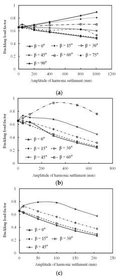 - The effect of the harmonic settlement-induced imperfection on the wind buckling capacity is complex. One aspect is that the effect of the amplitude of the harmonic settlement on the wind buckling capacity has a high likelihood of nonlinearity while the wind attack angle is given. The other aspect is that the effect of the harmonic settlement-induced imperfection on the wind buckling capacity is coupled with the wind attack angle.