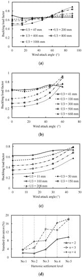 - The wind buckling capacity generally increases as the wind attack angle increases, while the amplitude of the harmonic settlement is given. Given that the case of is the basis, when the harmonic settlement level is low, such as settlement load No.1 and No.2, the biggest increase of wind buckling capacity is less than 20% with an exception; when the harmonic settlement level is high, such as settlement load No.3, No.4 and No.5, the biggest increase of wind buckling capacity is more than 40%, with a few exceptions.