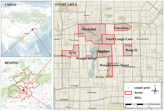Beijing, an ancient city with more than 700 years of history, is rich in historical and cultural heritage, having been subjected to a great contradiction between development and conservation [18]. Since 1990, the Beijing municipal government has successively designated historic preservation zones (HPZs). So far, there are 33 HPZs located in the old city, which are essential parts of the historic imperial city. Their functional nature has gradually evolved with the change of dynasties, from the royal court, the government offices, and factories providing logistics services to the residential blocks after the Qing dynasty. Currently, these zones are mainly for residence and tourism, showing the style and image of the ancient capital. This paper chose Shichahai, Dong Si, Xi Si, South Luogu Lane, Jingshan, Wenjin Street, Donghuamen Street, and Guozijian for the case study. These eight HPZs have their typical characteristics and are more popular with tourists. Many authors have also selected these regions as their research object [67,68,69,70,71]. Their geographical locations are shown in Figure 1.