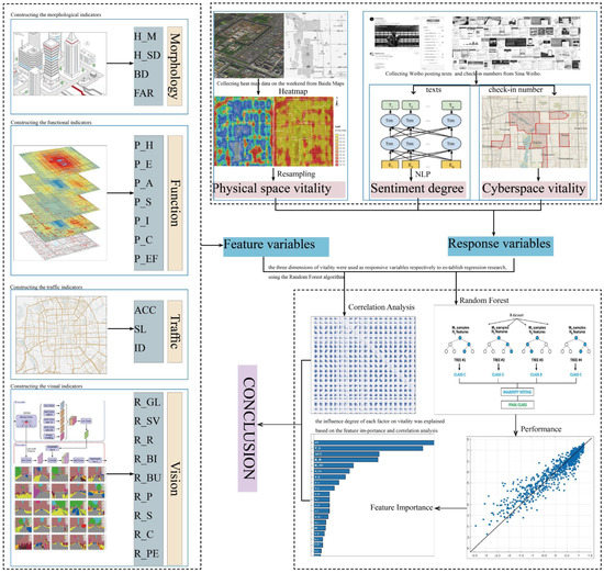 This study combines multi-source data and machine learning technology to evaluate the vitality characteristics of historical preservation zones (HPZs) and explore relevant influencing factors. A grid with a resolution of 100 m (approaching the minimum basic size of the old city of Beijing [72]) was used to divide the 8 HPZs into 842 units and then construct a buffer (radius = 250 m, the size selected contributed to the better performance of models after multiple attempts) with the centroid of each unit to calculate each indicator. The vitality characteristics of HPZs are divided into three dimensions, which are “physical space vitality”, “cyberspace vitality”, and “sentiment degree”. For the research conducted on the influencing factors, a total of 23 indicators were constructed from the four dimensions of block morphology, road traffic features, functional forms, and visual environment. Then, the three dimensions of vitality were used as responsive variables, respectively, to establish regression research, using the Random Forest algorithm (a supervised machine learning algorithm that is used widely in classification and regression problems) [73]. Lastly, the influence degree of each factor on vitality was explained based on the feature’s importance and correlation analysis. The workflow of this paper is shown in Figure 2.