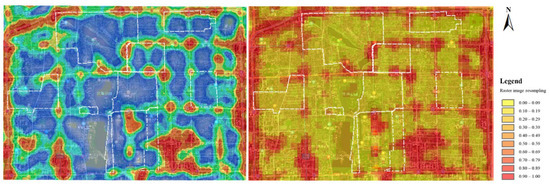 Baidu Mobile app services record people’s trajectories, offering an opportunity to reasonably and effectively observe the pedestrian flow density in the study area [74]. We collected heat map data on the weekend from Baidu Maps (http://lbsyun.baidu.com/, accessed on 19 June 2021), with a data sampling accuracy of 1 h, from 7:30 a.m. to 23:30 p.m. (19 June 2021). The raster data were imported into ArcGIS software and geo-calibrated using maps containing coordinates (WGS84 Universal Mercator Projection UTM Zone50). Due to lacking a precise legend, we used resampling technology (NEAREST) based on ArcGIS software to re-level the grid data of heat maps. Figure 3 shows the visualisation results.