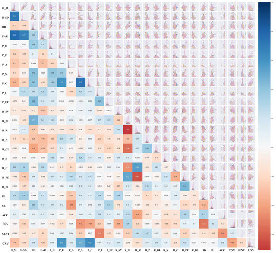 Indicators for dimensionless processing are processed through Z-score standardisation to meet the normal distribution (mean value of 0 and variance of 1). Secondly, python’s SciPy package is employed for the Pearson correlation test, and the correlation coefficients, ranging from −1 to 1, could be used to measure the linear correlation between two variables. The correlation degree and direction can be seen visually by the heatmap of the correlation coefficient matrix.