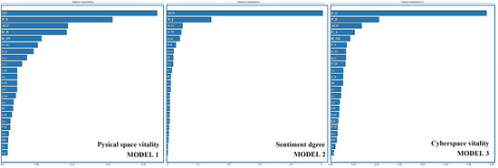 According to the regression results from Table 4, the Random Forest model established by the 23 indicators has a good fitting ability for the data distribution. R2 is the major metric to evaluate the performance of models. A higher R2 value implies the higher accuracy of a prediction model. Among them, the R2 of model_1 is 0.86, the R2 of model_2 is 0.85, and the R2 of model_ 3 is 0.76. The RMSE and MAE of each model is less than 0.5 and 0.4, respectively, where the lower RMSE and MAE value implies the higher accuracy of a prediction model. Compared to the R2 scores achieved by Wu et al. (0.315 and 0.425) [36], Xiao et al. (0.735) [23], Hunag et al. (0.760) [22], Niu et al. (0.618–0.869) [65], and Wu et al. (0.446–0.875) [9], it can be seen that the three models established in this study have a good performance in explaining the variables as well as good generalization. The models can be applied to the large-scale measurement of the three vitalities in the other HPZs of Beijing to conveniently obtain more rapid and refined results.