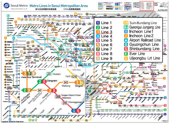 - Seoul Metro, December 2021 Number of People Using Each Station by Time Zone (Lines 1 to 8), Release 17 January 2022. Available online: http://www.seoulmetro.co.kr/kr/board.do?menuIdx=548&bbsIdx=2213467 (accessed on 17 January 2022).
