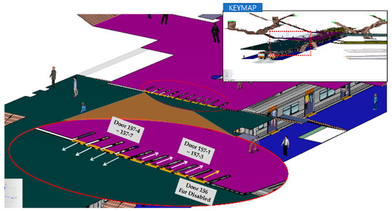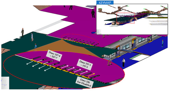 - Subway stations are Designated Facilities for Public Use facilities in a CBRE situation, and spaces for SIP must be designated inside the stations. However, if you look at the provided Station Evacuation Route Map (Figure 1), most of the stations’ evacuation routes are from the platform to the tunnel or to the outside, and, in most places, a separate evacuation space is not specified. The domestic evacuation time standards limit the evacuation time from outside to the SIP facility in a CBRE situation [43] and suggest evacuating to a safe space or outside within 6 min in the case of an emergency situation in the subway [4]. Therefore, in this study, the method that was the most efficient between moving outside in the case of an emergency situation or moving to SIP when an evacuation space for SIP is designated was studied.