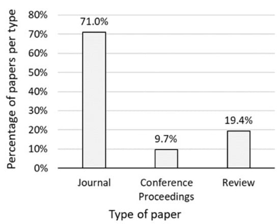 Details about the number of papers found after each screening phase are reported in Figure 2. A total number of 94 papers was firstly found, with 68 eligible for full paper reading. After this last process, six more papers were rejected, with a final number of 62 papers considered and analyzed in this essay. Further details on the selection process are available in a PRISMA flow diagram in Figure A1 in Appendix A. Most of the included articles (71.0%) are journal papers, followed by reviews (19.4%), and conference papers (9.7%) (Figure 3).