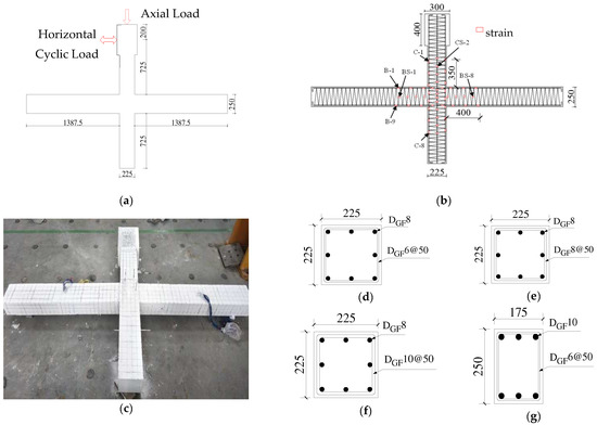 A total of nine joints were fabricated and tested, including eight GFRP concrete beam-to-column joints and one RC concrete beam-to-column joint as a reference specimen, and the scale ratio of all joint specimens was 1/2. The details of the test specimens are shown in Figure 3. The total length of the beam is 3000 mm, the calculated length is 2700 mm, and its cross-section is 175 mm × 250 mm. Meanwhile, to facilitate the lifting and test loading of the joint model, a certain length of loading head is reserved at the top of the column, and the distance from the lateral loading point to the fixed hinge at the base of the column is 1800 mm. The cross-section of the column is 225 mm × 225 mm.