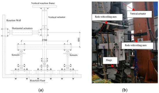 In this study, a pseudo-static loading test was carried out. As shown in Figure 4, two electrohydraulic actuators were mounted at the top of the column to the reaction frame and reaction wall. The vertical actuator provided a constant axial force and the horizontal actuator applied a cyclic load; the maximum allowable capacity of the horizontal and vertical actuators was 500 and 1000 kN, respectively. Meanwhile, the double hinge devices mounted at the end of the beams were attached to the reaction floor, and the force transducers were arranged on devices to measure the vertical reaction force at the beam end. Moreover, two rods with rolling axes were installed at the top of the column to limit the out-of-plane movement (seen in Figure 4b). To ensure that the rods did not affect the lateral translation of the specimens, it should be noted that one end of the rods was fixed to the vertical reaction frame, and the opposite end had rolling axes supporting the specimen.