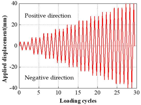 Furthermore, the cyclic loads were applied by a displacement-controlled mode until the specimen fractured, which is shown in Figure 5. The cyclic loading procedure consists of several loading steps gradually increasing in lateral displacement, where the displacement increment is 5 mm per step, and three full cycles were conducted for each level. Meanwhile, strain gauges with a diameter of 3 × 5 mm were installed at the plastic hinge zone of the beam and column, respectively, as shown in Figure 3b. A total of 52 strain gauges were used in per specimen. In addition, a total of 14 displacement sensors were used to obtain the average curvatures of column and beam at different displacement levels. The displacement sensors were arranged in the potential plastic hinge zone and core of the beam and column.