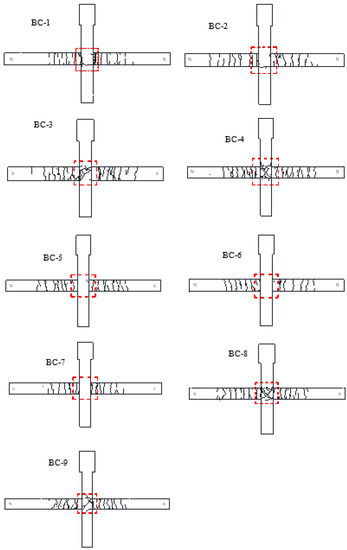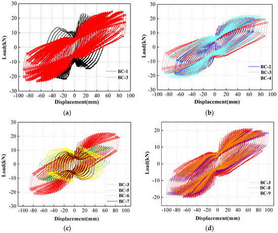 Figure 6 shows the failure mode of each joint specimen after testing. The cracks of all specimens are mainly concentrated in the plastic hinge area of the beam; however, a few cracks occur in the non-core area of the columns, and all joint specimens undergo concrete cracking and cover concrete spalling. During the test, the first vertical bending crack appeared at the beam-to-column junction when the displacement of the column top was ±4 mm. As the cyclic load increased, a large number of cracks appeared in the plastic hinge area of the beam. Thereafter, when the cyclic load approached the peak load, cracks appeared in the beam-to-column intersection line and core area, except in the case of specimens BC-5, -6, and -7.