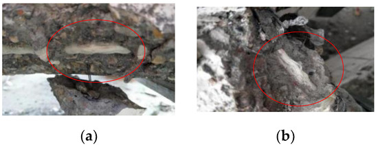 Observed damage of GFRP. (a) Outer rubber layer failure (BC-9); (b) Fiber bundle breakage (BC-3).