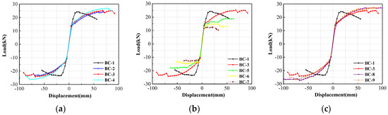 Figure 8 shows the hysteresis load–displacement loops obtained from the cyclic loading tests. In the case of the RC joint specimen (BC-1), the total area under the hysteresis loops increases with cyclic loading after it enters the plastic phase, and a pinching phenomenon occurs at the same time. However, the hysteresis loops of specimens with different stirrup ratios and concrete strengths do not show obvious pinching phenomena. It can be speculated that the deformation of the reinforcement in the RC joint grows rapidly after yielding, and the relative slip of the concrete and reinforcement increases; however, in the case of the GFRP joints, due to the restraining effects provided by the fiber spiral hoop, the relative slip of the GFRP bars is very small after concrete failure. Therein, the maximum displacement of BC-7, which had the largest axial pressure ratio, was the smallest, and the pinching phenomenon was the most obvious among the GFRP joint specimens. In general, the energy dissipation of the GFRP joint specimens is significantly lower than that of the RC joint.