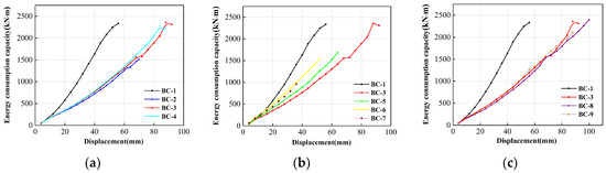 In general, the energy dissipation capacity of the joint member can be calculated by the total area under the hysteresis loops, which is used to express the energy dissipated by the member in the process of an earthquake, as shown in Figure 10. It can be observed that all joint specimens dissipate little energy in their elastic phase; thereafter, the energy dissipation capacities increase since the specimens enter the plastic phase. Therein, the energy dissipation of the RC joint increases abruptly when the displacement of the column top reaches ±8 mm, which is significantly larger than that of the GFRP joints. However, because large plastic deformation occurs in the RC joint, the damage degree is more serious than that in the GFRP joints; therefore, the energy dissipation capacity increase rate in the RC joint becomes slower, and those of the GFRP joints still grow steadily, indicating that the GFRP joints still have a strong energy dissipation. At the same time, the hysteretic energy dissipation capacity of the GFRP joints is reduced by approximately 50% relative to that of the RC joint. Comparing the GFRP joints, it can be concluded that the energy dissipation capacities increase with the stirrup ratio due to the confinement effect on the concrete by GFRP hoops. Meanwhile, among the axial pressure ratio groups (BC-3, BC-5, BC-6, and BC-7), BC-3, having the smallest axial pressure ratio, consumes the least energy, which implies that an appropriate increase in the axial pressure ratio can lead to an increase in the energy dissipation capacities of the joint members by enhancing the aggregate interlock of concrete. On the other hand, the energy dissipation capacity of specimen BC-8 is lower than those of BC-3 and BC-9. For example, the energy dissipation capacity values of BC-8 is 5.55% and 2.22% lower than that of BC-3 and BC-9, respectively, both being under the +84 mm working condition, indicating that the energy dissipation capacity of the GFRP reinforcement beam-to-column joints increases with increasing concrete strength, but the increase is not obvious.