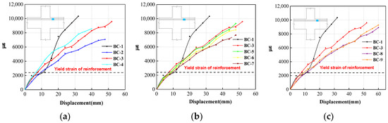 In addition, Figure 13 shows the maximum strains of the GFRP hoops in the core area. As expected, the maximum strain in the RC joint specimen is significantly greater than those in the GFRP joint specimens, indicating that there are greater shear forces occurring in the core area of the RC joint due to the high stiffness of the longitudinal steel beam reinforcement. Comparing the GFRP joints with different variables, the maximum strains of the GFRP hoops increase with the stirrup ratio and decrease with the axial pressure ratio, and the maximum utilization rate captured in the joint stirrups exceeds 11.9% (BC-4). The GFRP hoop strains did not exceed their ultimate strains in the end. In conjunction with the final damage of the specimens, no significant damage occurs in the concrete in the core of the joint specimens, indicating that the reinforcement scheme of GFRP hoops in the core is appropriate for the joint.