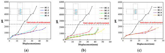 Maximum strains of longitudinal reinforcement. (a) Stirrup ratio group; (b) Axial pressure ratio group; (c) Concrete strength group.