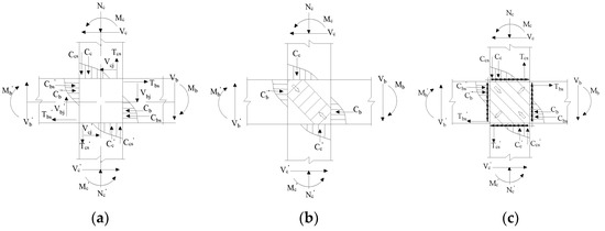 The reinforced concrete beam-to-column joint is very complex in terms of forces, and the core force transfer mechanism is shown in Figure 14. Its complex hysteretic behavior can be simulated by means of recent accurate and efficient models [18]. In the beam-to-column joint, there are two types of force transmission mechanisms: the inclined compression rod mechanism and the truss mechanism [19]. The diagonal compression bar mechanism (shown in Figure 14b) means that when the joint is subjected to an external load, the concrete pressure Cb at the beam end and the concrete pressure Cc at the column end will cancel a portion of the shear force of the beam-to-column section, forming a diagonal pressure field in the core area of the joint. Figure 14c shows the schematic diagram of the “truss mechanism”. At the beginning of loading, the concrete in the core area bears tensile stress, which gradually increases until it reaches the tensile limit of the concrete. After the concrete cracks, the hoop reinforcement and vertical longitudinal reinforcement will bear the tensile stress, and the tensile forces Tbs and Tcs, and pressures Cbs and Ccs provided by the beam and column reinforcement will offset another part of the beam-to-column section shear force, which will be transferred to the core area to form the shear stress field and act together with the compressive stress field of the diagonal compression bar mechanism to form the truss mechanism [20].